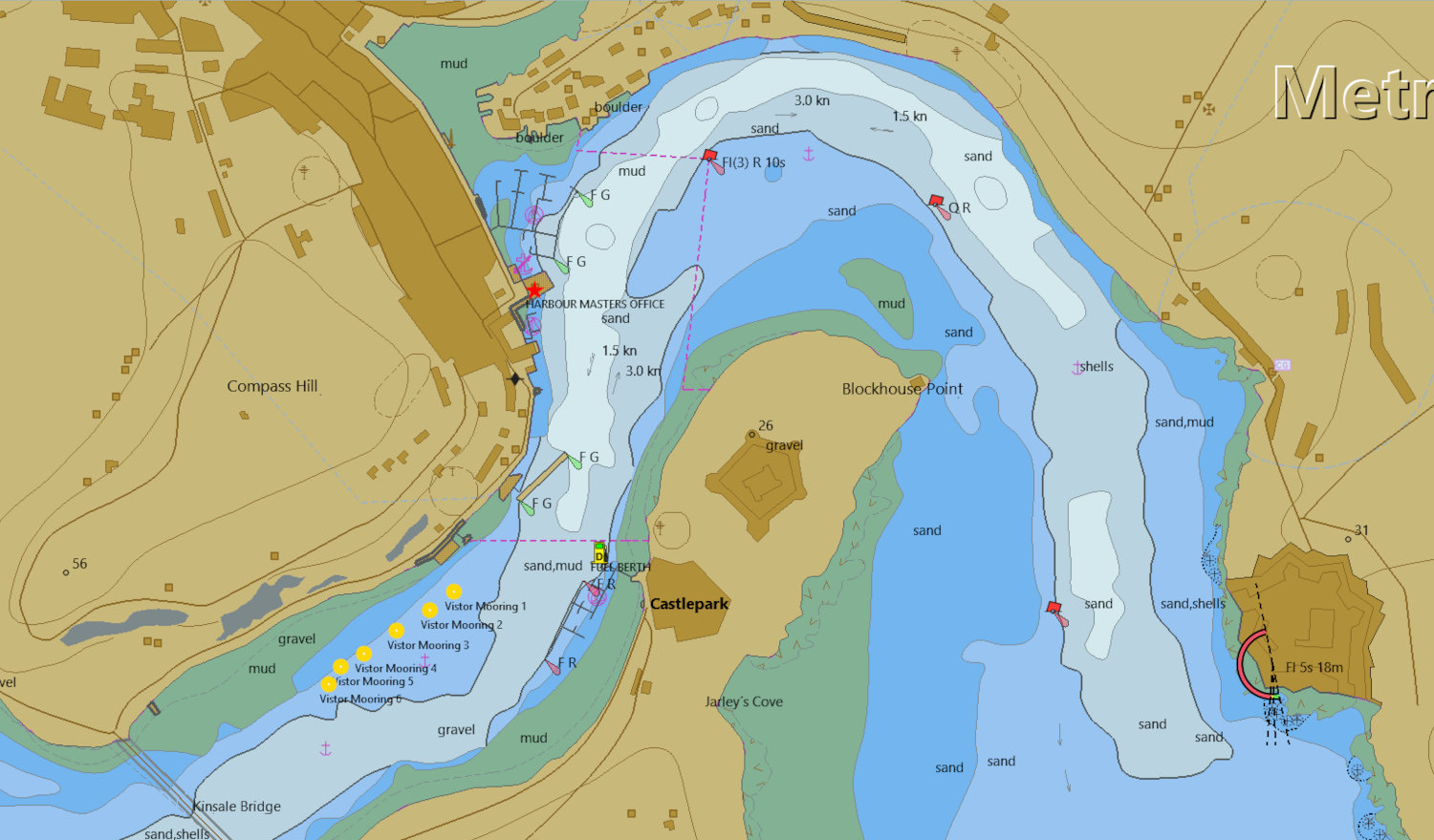 Cork County Council has 6 visitor moorings in Kinsale harbour. The are each marked with large flat circular mooring buoys 120cm wide and rise approximately 50cm above the waterline. Please contact Kinsale Harbour master for more information. Kinsale Yacht Club maintains a further 6 visitor moorings.